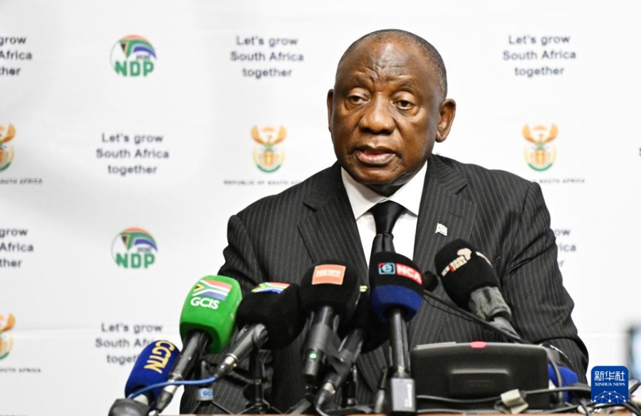 2024年12月3日,在南非开普敦,南非总统拉马福萨在南非担任G20轮值主席国启动仪式上发表讲话。新华社发(哈比索·姆卡贝拉摄)