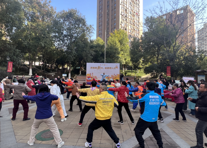 活动舞台上的内容设计丰富多元,兼顾实用性与趣味性。在“养生健体”环节,嘉信物业公司相关负责人带领三十余名新就业群体学习传统健身功法“八段锦”,通过一招一式的分解教学,帮助大家舒缓疲劳、强健体魄。随后的“生命守护”环节,红十字会专业医护人员现场演示了海姆立克急救法和心肺复苏等关键急救技能,并分享了户外急救小贴士,为辛勤工作的新就业群体筑牢安全屏障。舞台下的“趣玩时光”区域,外卖骑手和快递小哥积极参与“环环相扣”“筷运乒乓球”等互动游戏和创意手工制作,大家欢声笑语不断,在繁忙工作之余得到了久违的放松。
