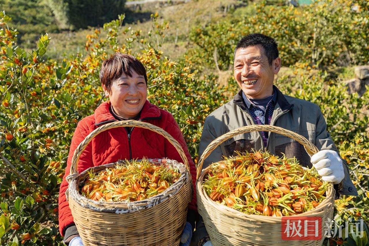 “大家赶紧都过来。”王继明的一声吆喝,采果工人随即将自己名下采摘装袋的栀果搬出田坎,栀果滚落的哗啦声与过秤的嘀嘀声交织。村民王大姐挎着满篮栀果走来,篮沿堆得冒尖:“趁着农闲来,一天挣个两百多块钱补贴点家用也是好的。”她抹了抹额头上的汗,眼角里满是笑意。