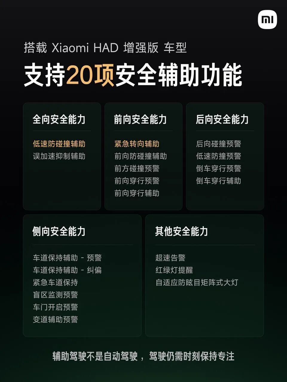 本次Xiaomi HyperOS 1.11系列更新后,小米汽车已拥有20项安全辅助功能。