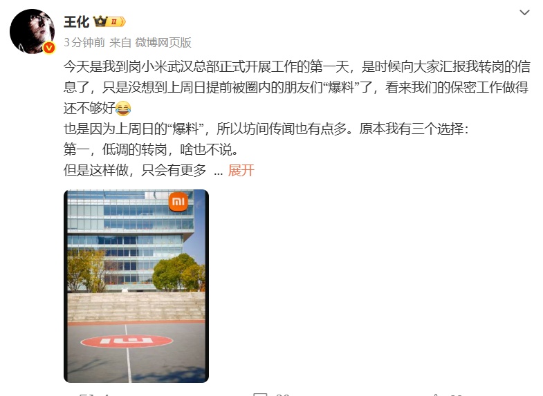 11月21日,小米王化发长文回应转岗,称自己已到岗小米武汉总部正式开展工作,希望大家不要过度解读。