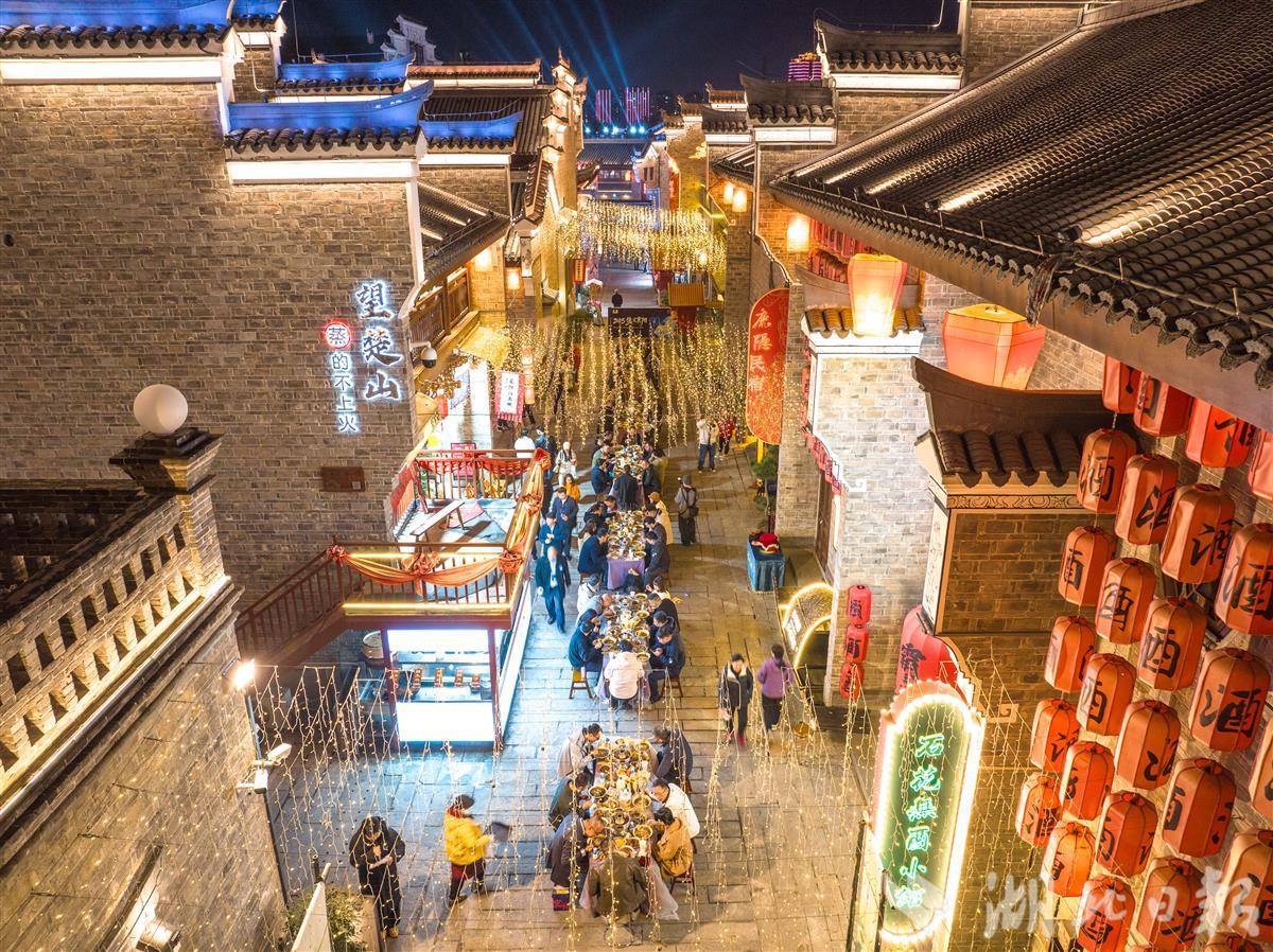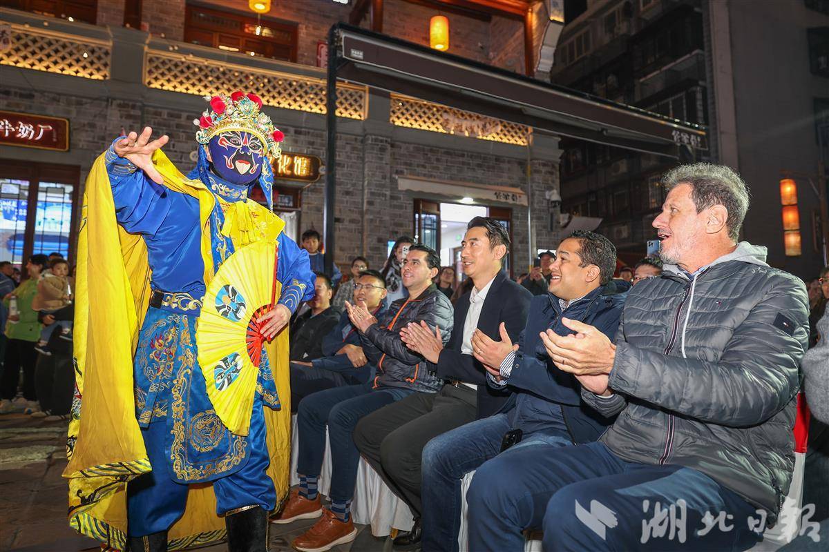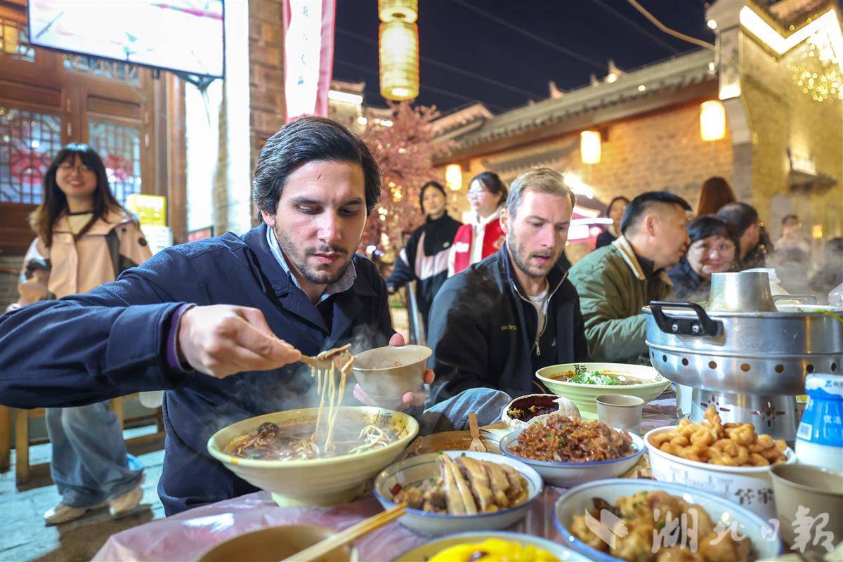 11月20日,外国友人来到襄阳古城管家巷,游览古城夜景、观看传统表演、品尝长桌宴美食,在襄阳美食与文化浸润中,感受襄阳古城魅力。(视界网 杨东 摄)