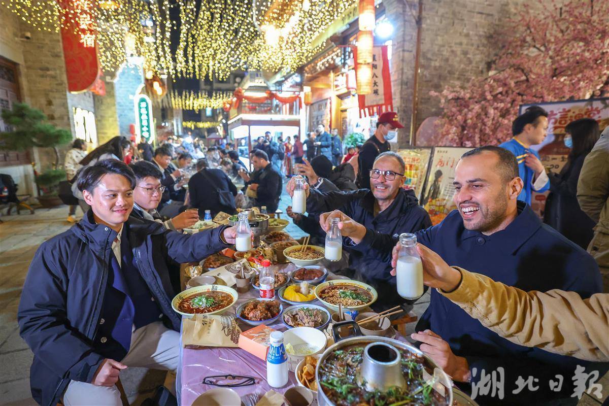 11月20日,在襄阳古城管家巷,外国友人体验长桌宴、品尝襄阳牛肉面。