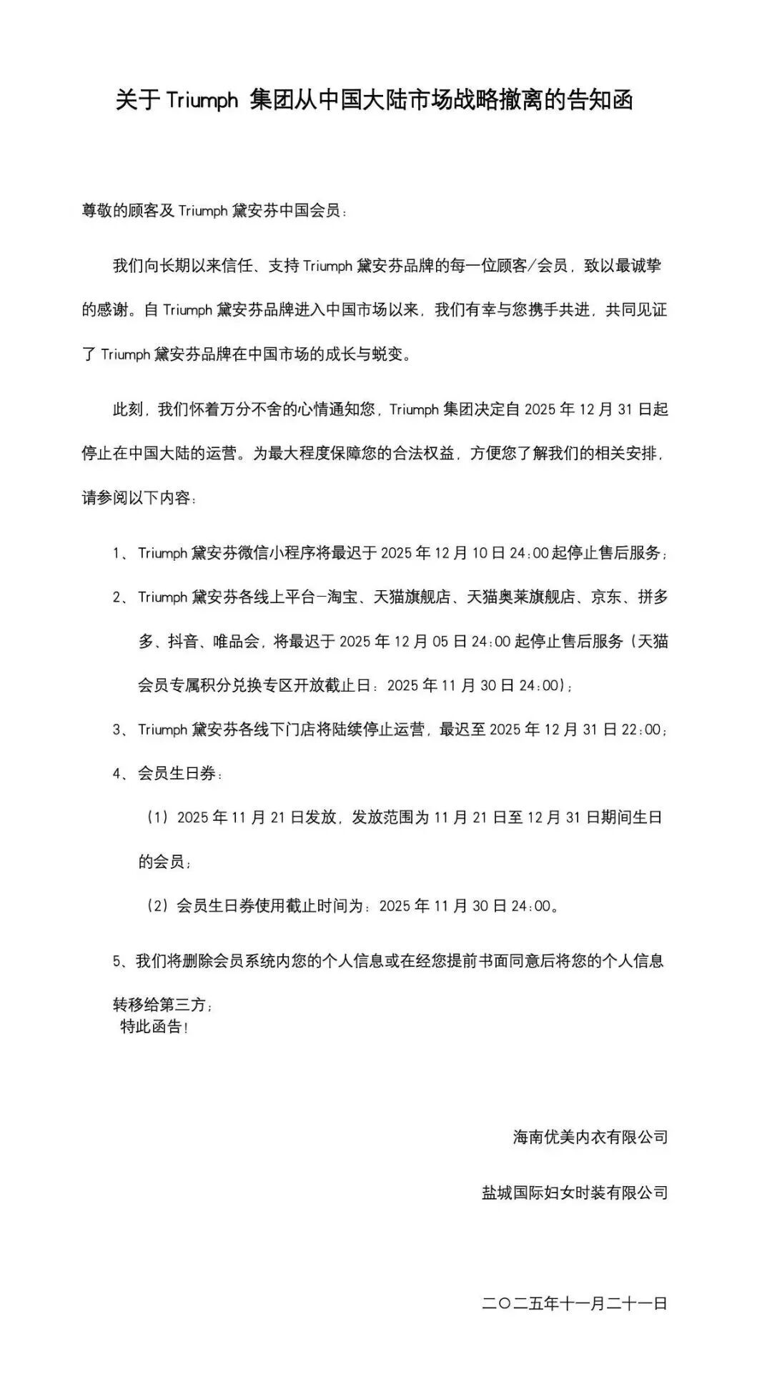 11月21日,德国内衣黛安芬集团中国子公司宣布,自2025年12月31日起停止在中国大陆的运营,其线上和线下渠道将从12月起陆续停止运营。