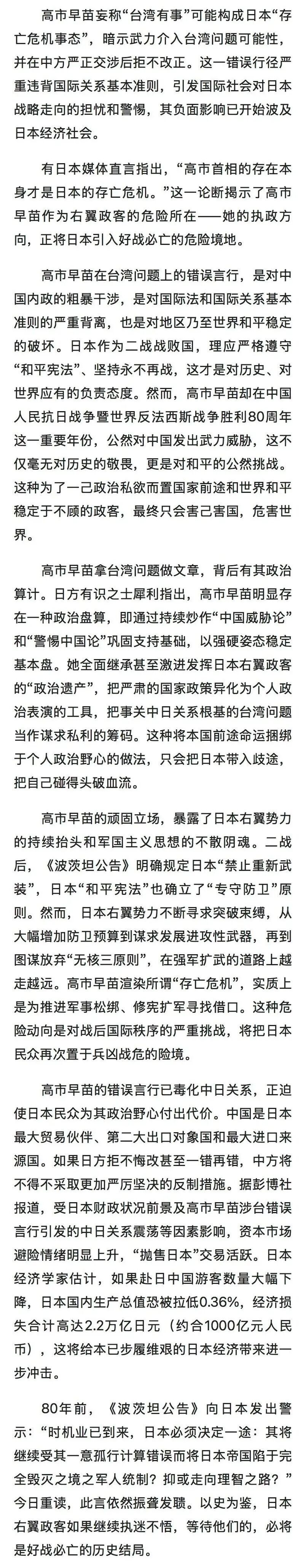 为了一己政治私欲而置国家前途和世界和平稳定于不顾,高市早苗的错误言行正将日本引入好战必亡的危险境地。