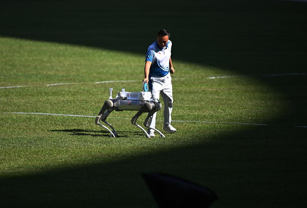 11月16日,在田径男子十项全能铁饼比赛中,机器人在运送铁饼。
