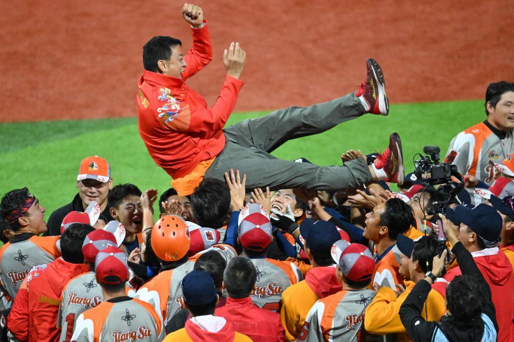 11月20日,江苏队成员在棒球1-2名决赛后庆祝夺冠。