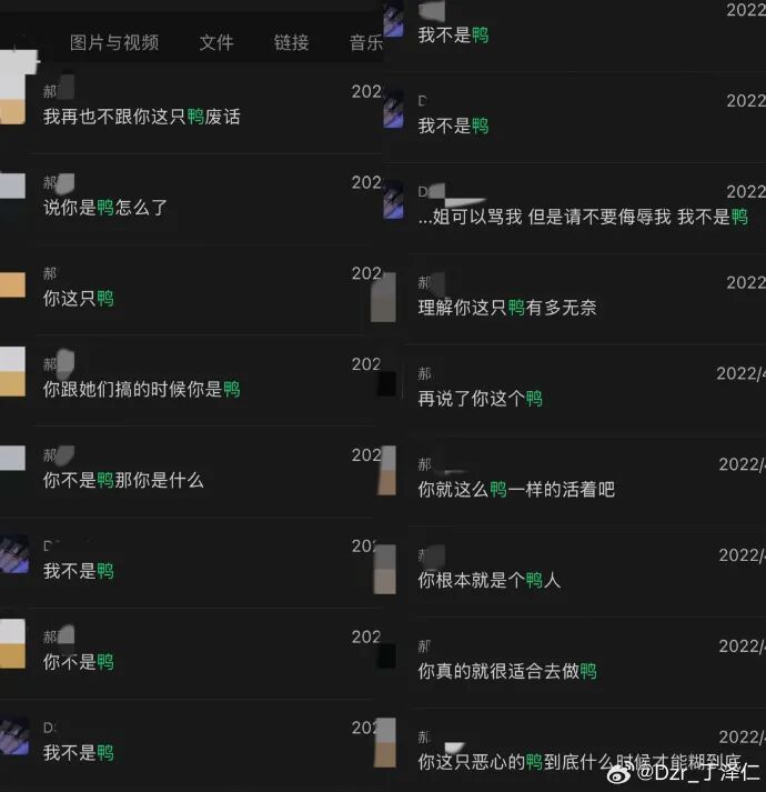 在丁泽仁晒出的聊天记录中,该女士多次喊丁泽仁“鸭”“狗东西”,让他“自宫”“去死”。