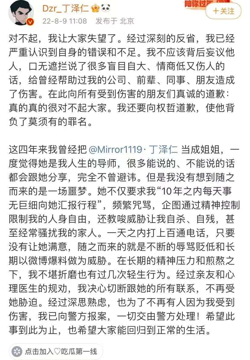 2022年8月9日,丁泽仁发文回应,称站姐企图通过精神控制限制他的人身自由,还教唆威胁让他自杀、自残,甚至经常骚扰他的家人,已向警方报案。