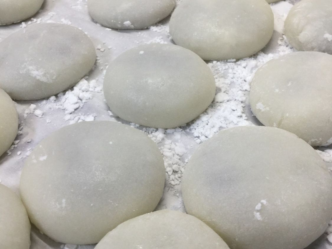 人们将糯米团捏成圆扁形状、包入馅料