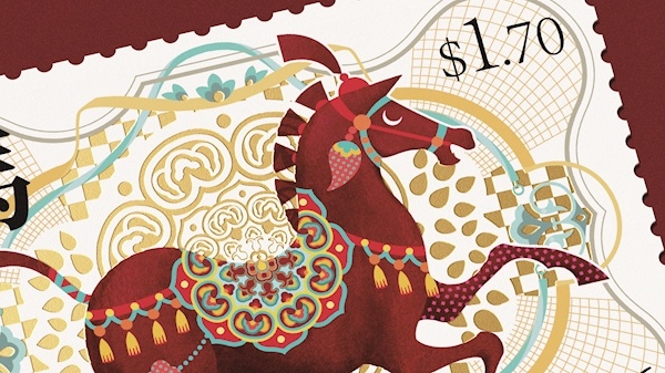 邮票的画面风格则运用现代插画的矢量图形语言,用时尚的方式描绘出古老的灵魂:拼贴式的马身,如同记忆碎片,穿插着几何纹样与传统图腾,设计强化装饰性与符号感,既有东方美学“满构图”的饱满气韵,又有着当代视觉的清晰与秩序,繁而不乱,简而不空。