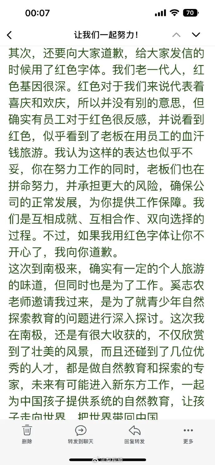 俞敏洪首先向员工表达了歉意,写信时在南极,因此用了一些南极的描述和比喻,触发了一些员工的不满,并没有要向大家炫耀在南极的意思,而是一直希望能够真诚和大家分享我的观点和情况。“一个愿意和大家分享的老板,总比一个神秘的老板更加让员工放心和安心。”