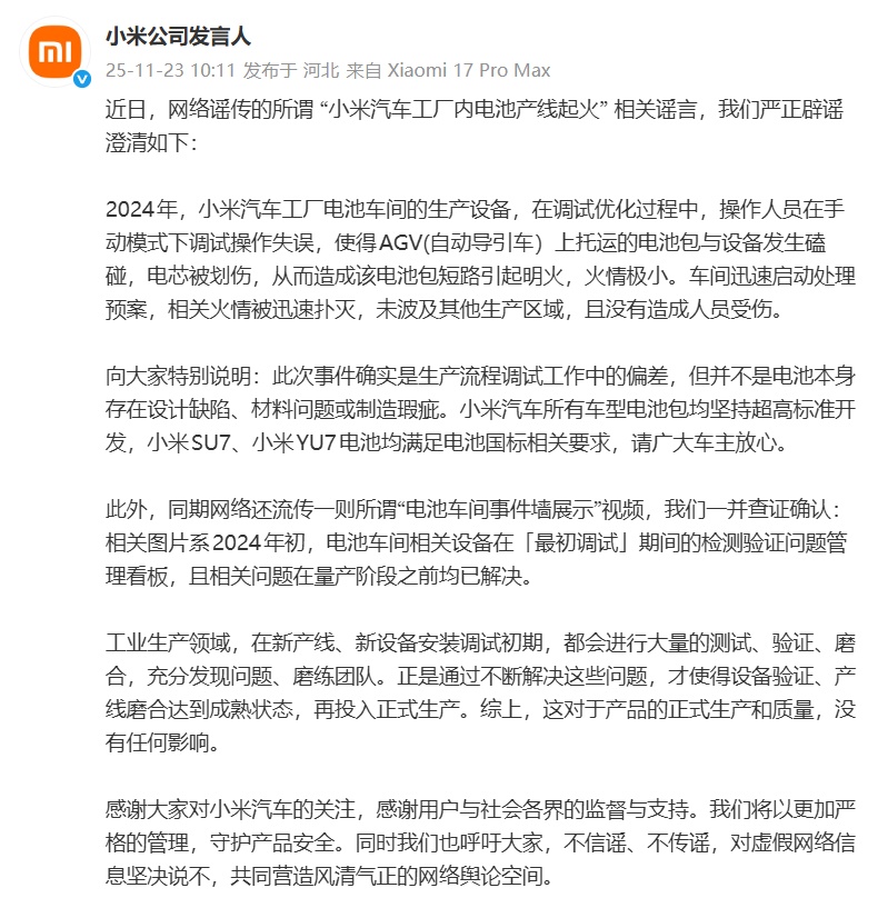 11月23日,@小米公司发言人 发文辟谣小米汽车工厂内电池产线起火。