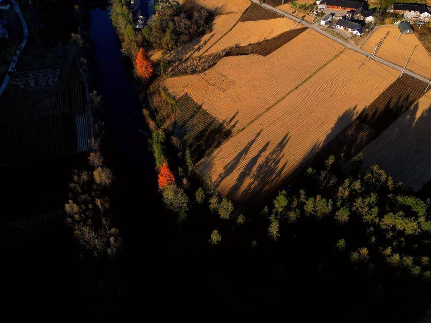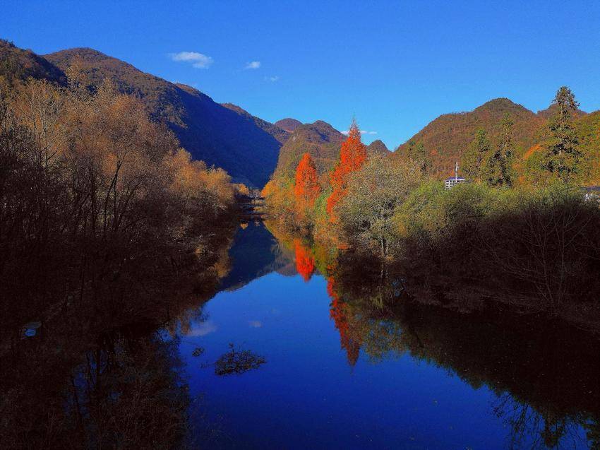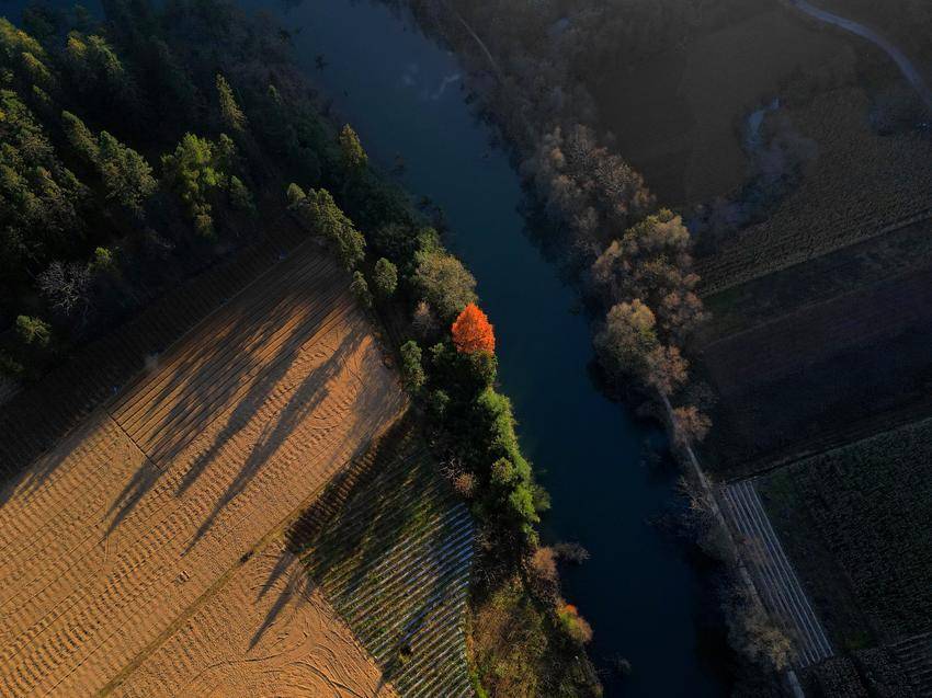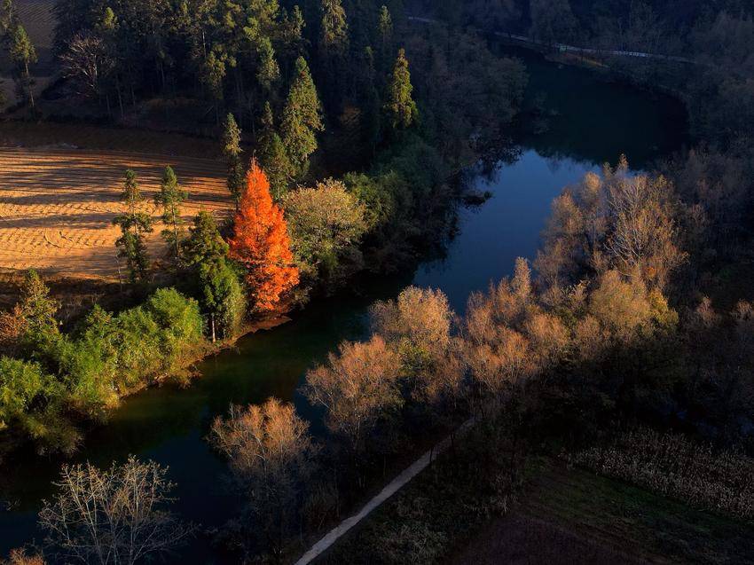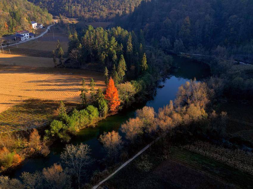 无人机腾空而起,镜头下的董家河如一条碧绿的丝带,静静地停留在村庄一方。水边的绿林深处,红杉树燃着热烈的火焰,细碎的叶片在阳光下透亮如霞,为青绿的底色缀上浓墨重彩的一笔。成片的田园村庄,高铁工程部与斑斓的丛林相映成趣。