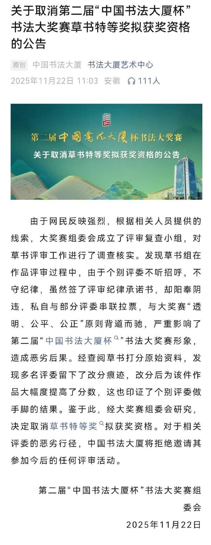 11月22日,第二届“中国书法大厦杯”书法大奖组委会发布公告,称发现草书组在作品评审过程中,有个别评委私自与部分评委串联拉票,经查阅草书打分原始资料,发现多名评委留下了改分痕迹,经大奖组委会研究,决定取消草书特等奖拟获奖资格。据该书法大奖赛公开资料,本次大奖草书特等奖奖金高达50万元。
