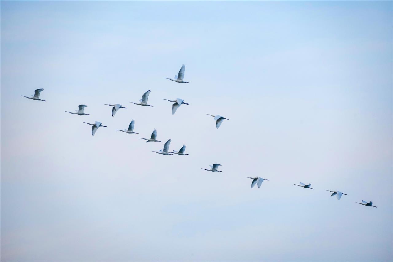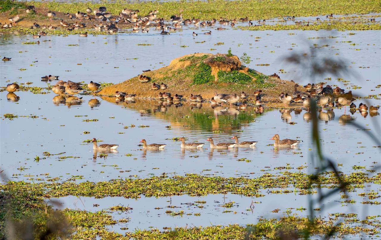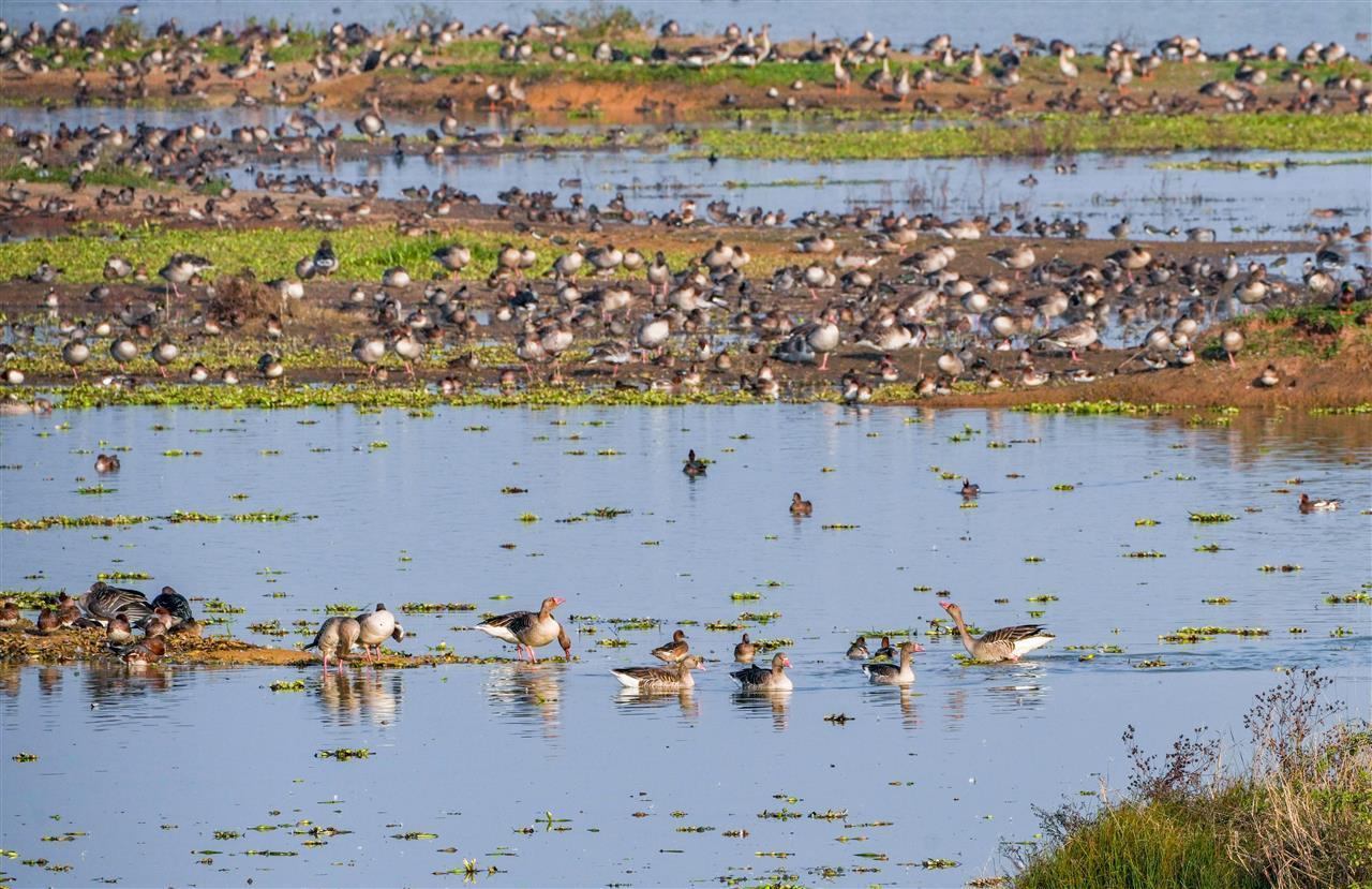 当天下午,天鹅湖湖面一派祥和灵动景象。大量的豆雁、灰雁、罗纹鸭、绿头鸭等雁鸭类候鸟齐聚于此,它们或在湖中低头觅食,或在岸边舒展翅膀晒太阳,或在水中自由游弋,时而有成群候鸟振翅起飞,在天空中形成壮观的飞鸟阵列。更令人惊喜的是,湖中有数量不菲的国家二级保护动物小天鹅、白琵鹭等穿梭其间,小天鹅姿态优雅,白琵鹭长喙轻啄,为这片生态秘境增添了珍贵的观赏价值。