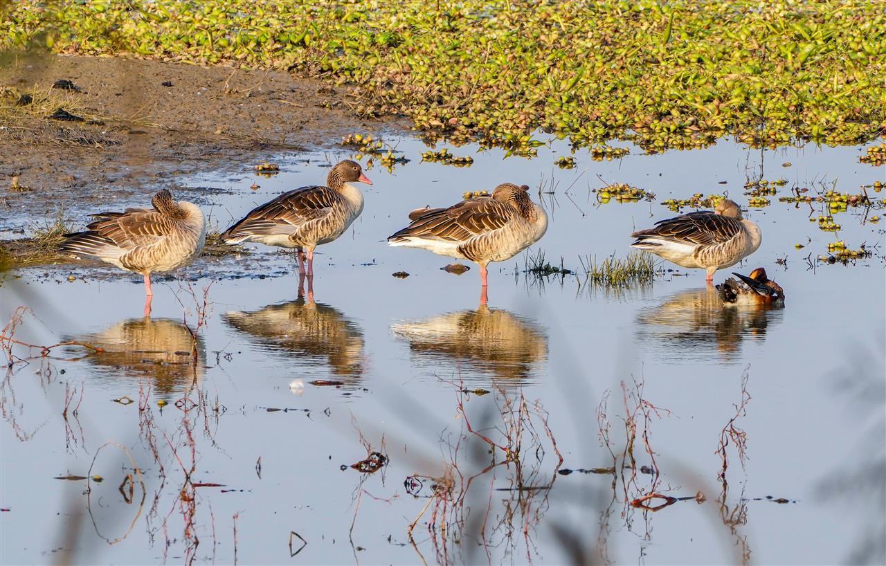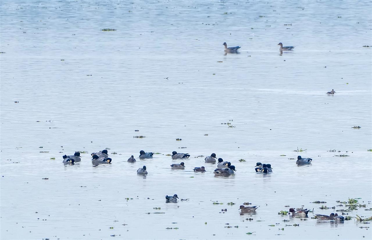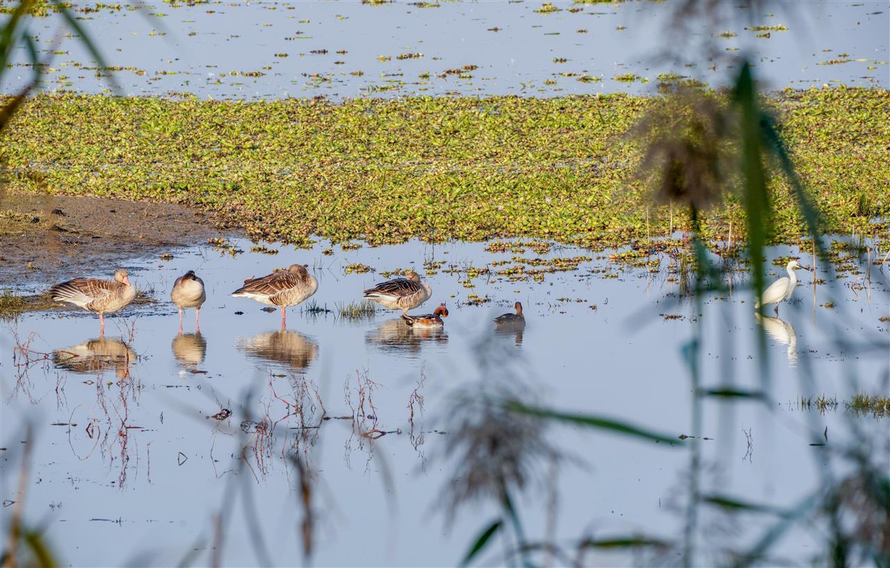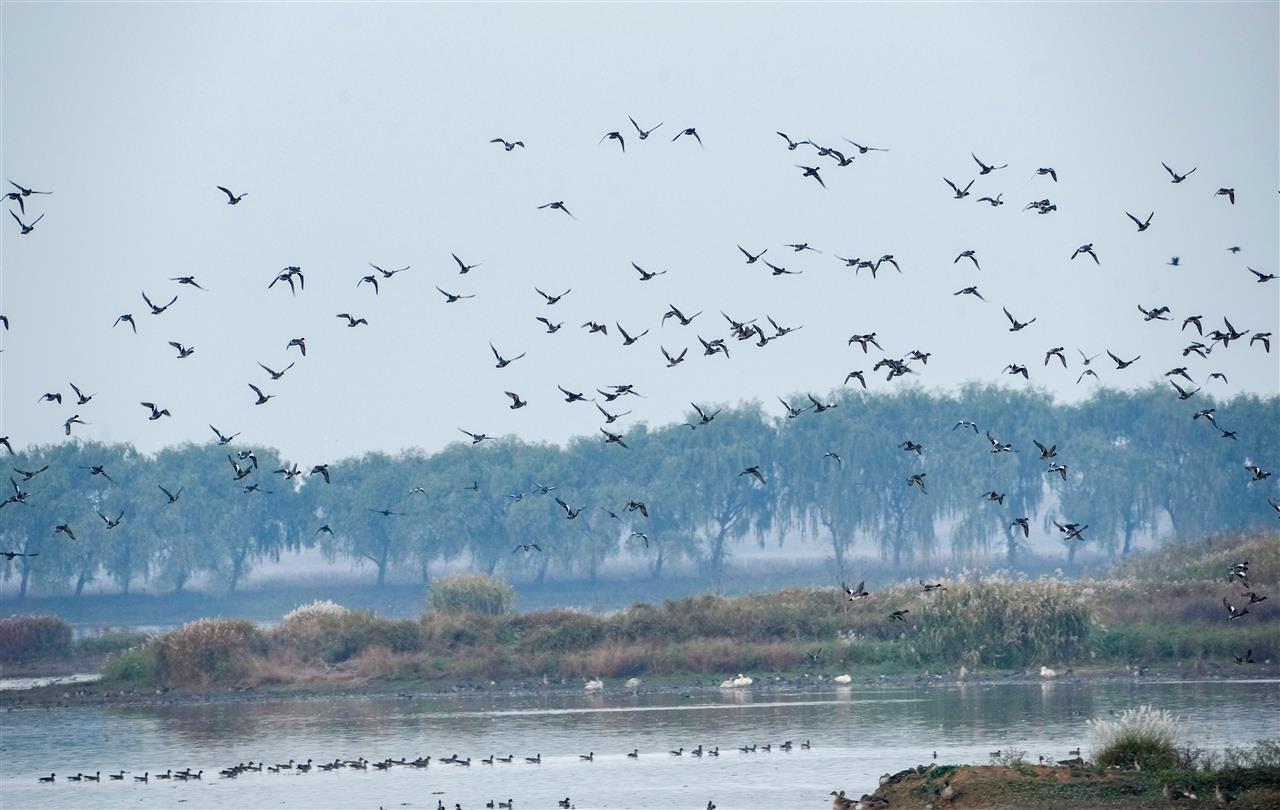 当天下午,天鹅湖湖面一派祥和灵动景象。大量的豆雁、灰雁、罗纹鸭、绿头鸭等雁鸭类候鸟齐聚于此,它们或在湖中低头觅食,或在岸边舒展翅膀晒太阳,或在水中自由游弋,时而有成群候鸟振翅起飞,在天空中形成壮观的飞鸟阵列。更令人惊喜的是,湖中有数量不菲的国家二级保护动物小天鹅、白琵鹭等穿梭其间,小天鹅姿态优雅,白琵鹭长喙轻啄,为这片生态秘境增添了珍贵的观赏价值。