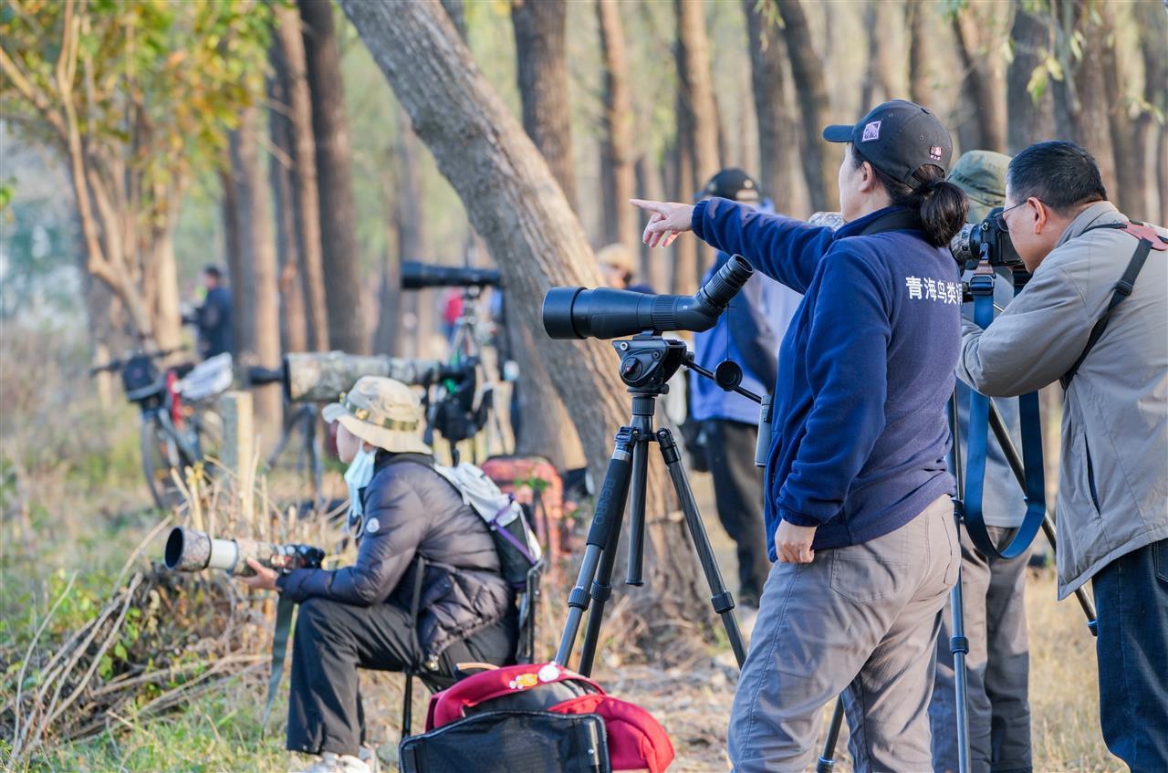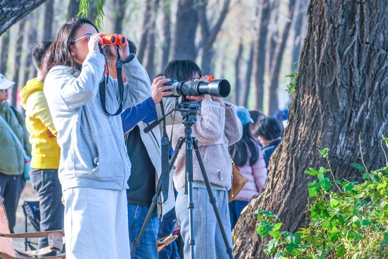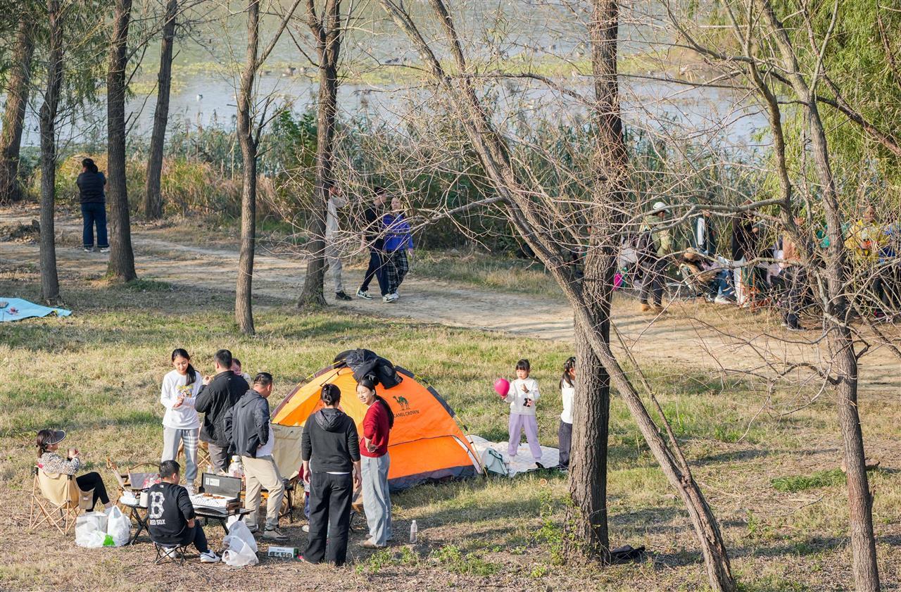 湖边堤岸上,前来观鸟、拍鸟的车辆排起长队。观鸟爱好者们架起“长枪短炮”,专注捕捉候鸟的灵动瞬间,快门声此起彼伏;不少家长带着孩子,手持望远镜仔细辨认鸟类品种;多家自然课题机构组织的研学团队更是成为一道风景线,孩子们在老师的带领下观察鸟类、现场画鸟,在亲近自然中学习生态知识。部分家庭还在堤边搭起帐篷,安营扎寨,伴着雁鸣和鸟啼享受惬意的周末时光。