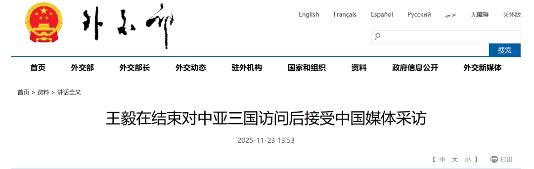 11月23日,外交部网站发布《王毅在结束对中亚三国访问后接受中国媒体采访》,全文如下: