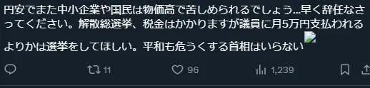 帖文大意:日元贬值将让中小企业和民众再次饱受物价上涨之苦……(高市)尽快辞职。
