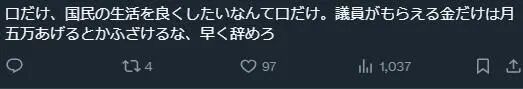 帖文大意:只会空谈改善民生,却给议员每月涨5万(日元)工资,太荒唐了,赶紧辞职!