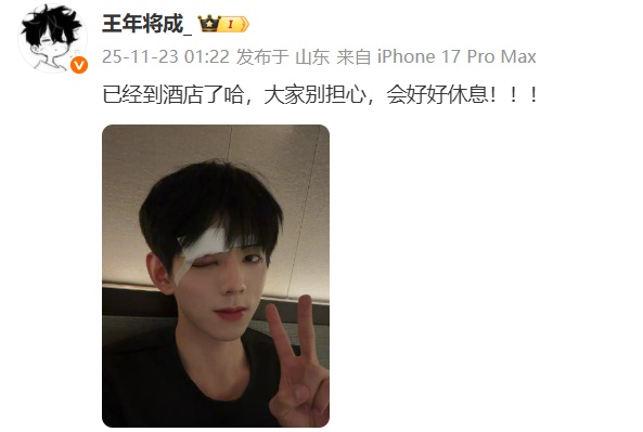 23日,王年将成公开眼部撕裂性伤口及肿胀淤紫照片,配文“已到酒店,大家别担心,会好好休息。”