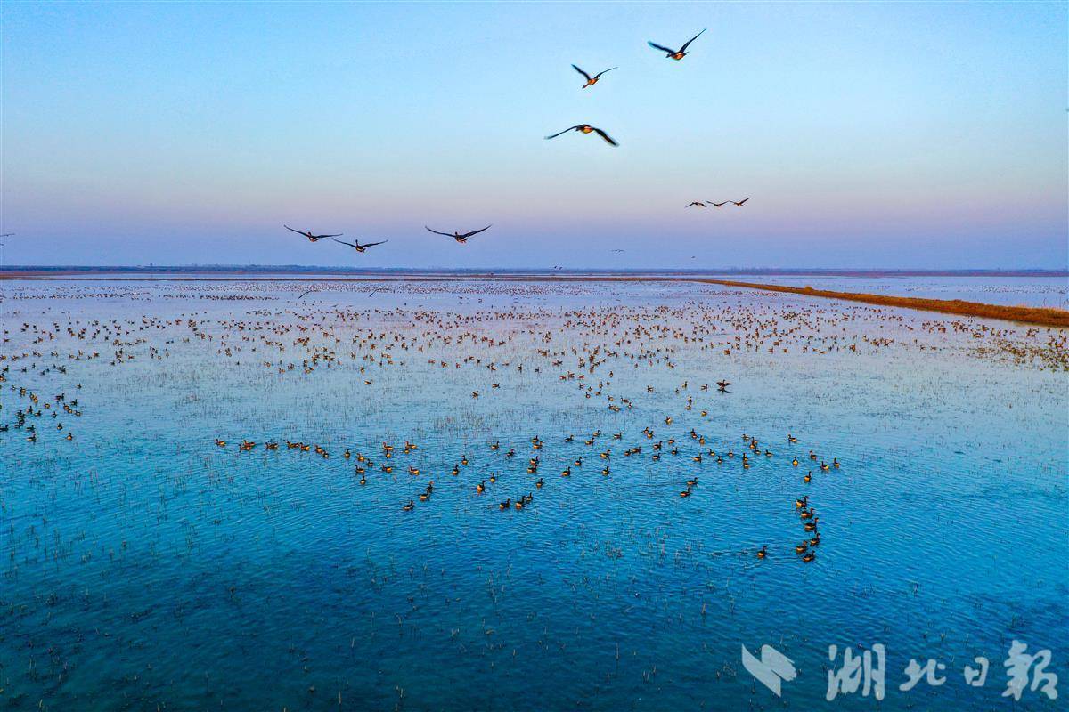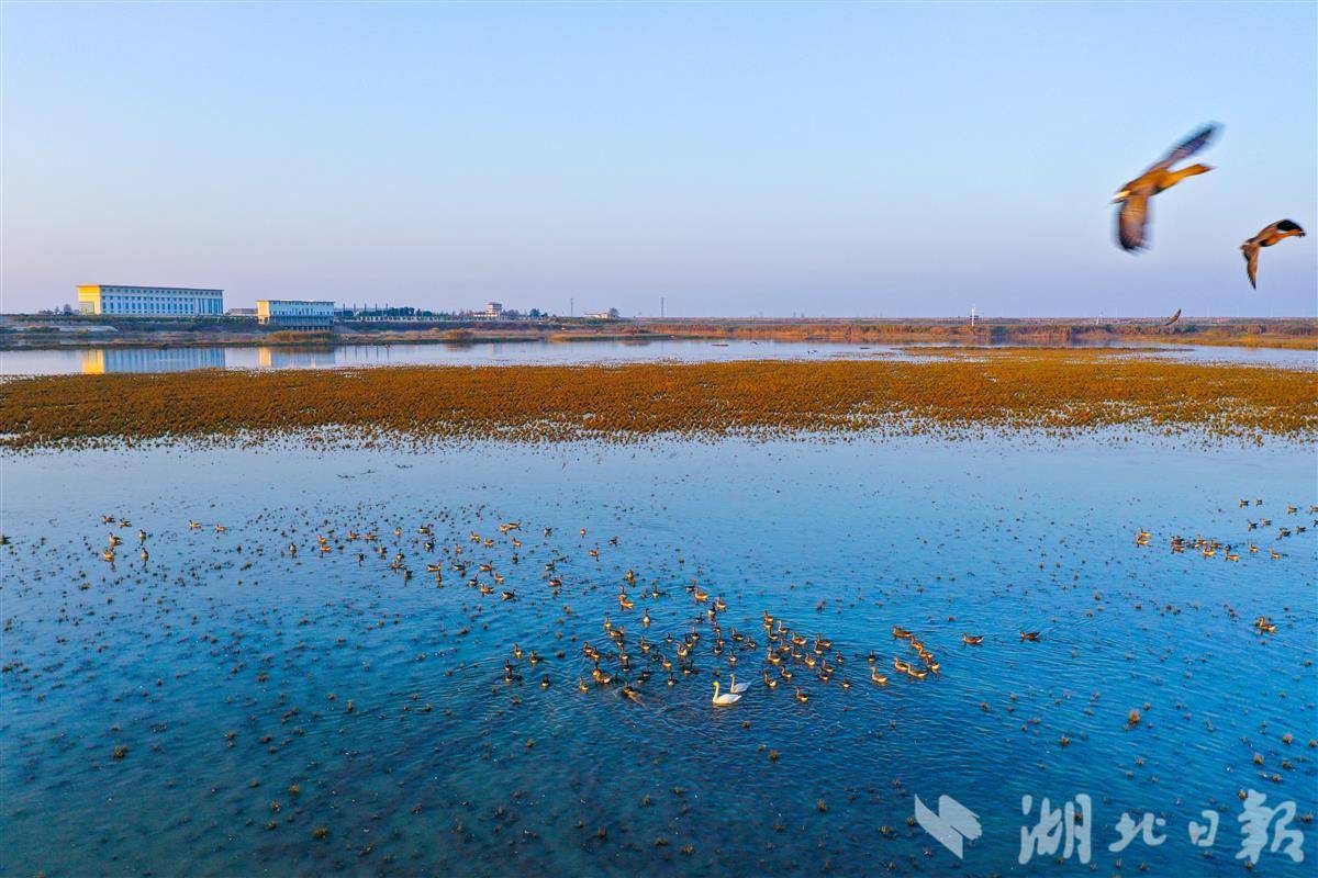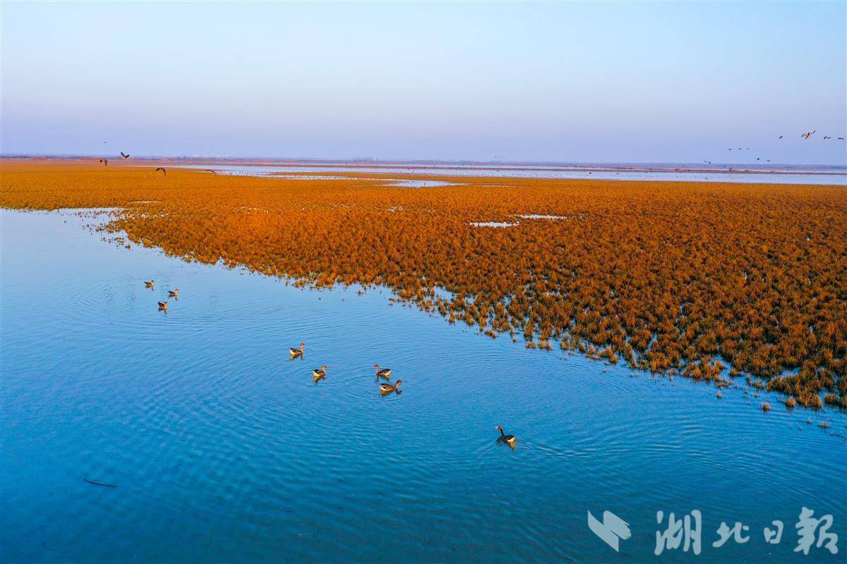 11月22日,仙桃市沙湖国家湿地公园芦花漫卷、鸟声阵阵,三五成群的候鸟嬉戏觅食,野趣横生。