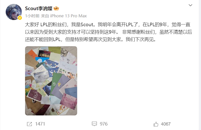 11月23日,电竞选手Scout发文回应将离开LPL并感谢粉丝9年陪伴:
