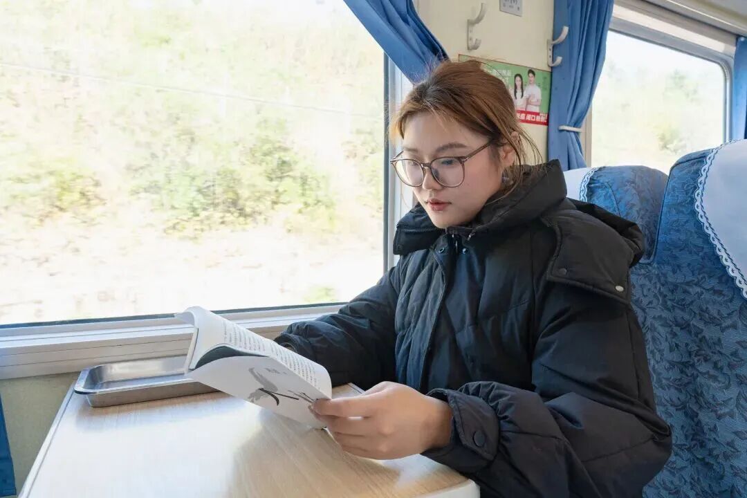 旅途中累了,便看看车窗外“绿水青山画中游”的美景,感受车厢里“南腔北调话家常”的鲜活。若有人问起读的什么书,便能畅聊感悟、以文会友,这何尝不是一种文雅的高光时刻?