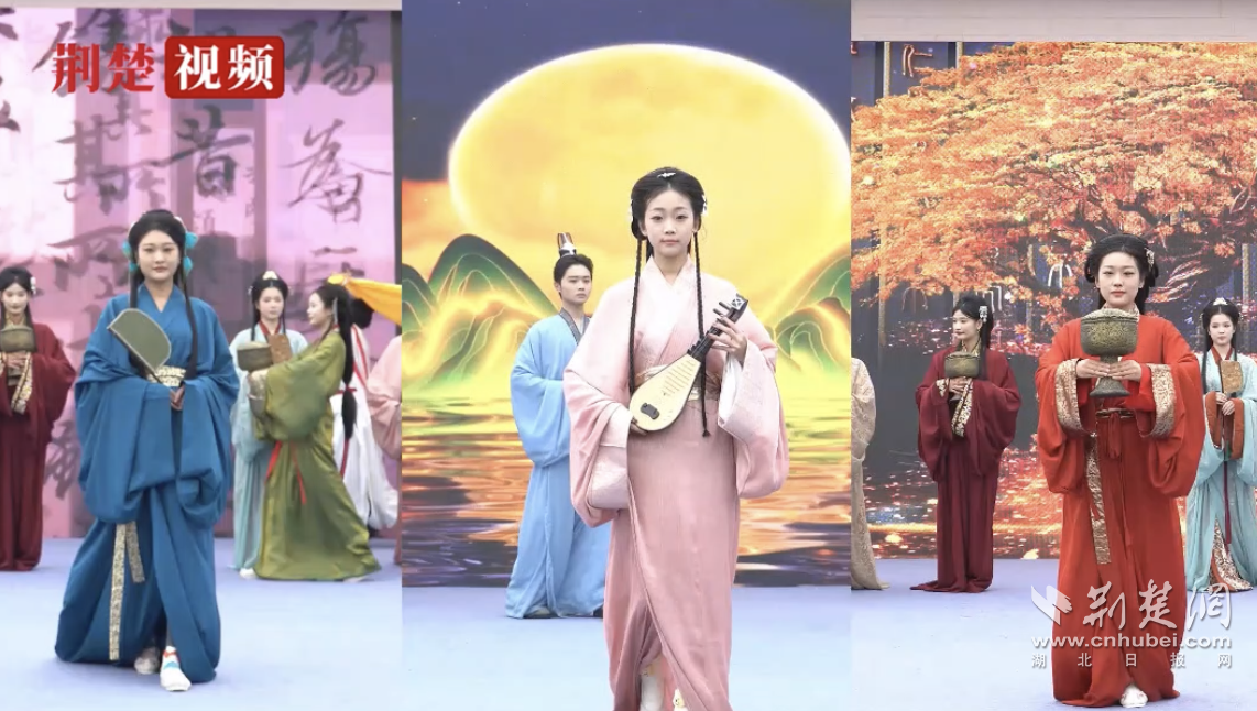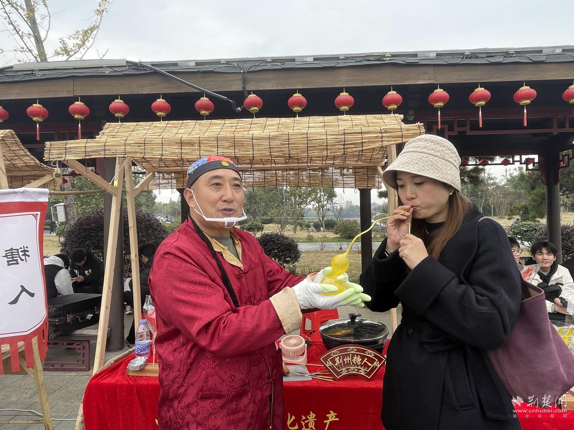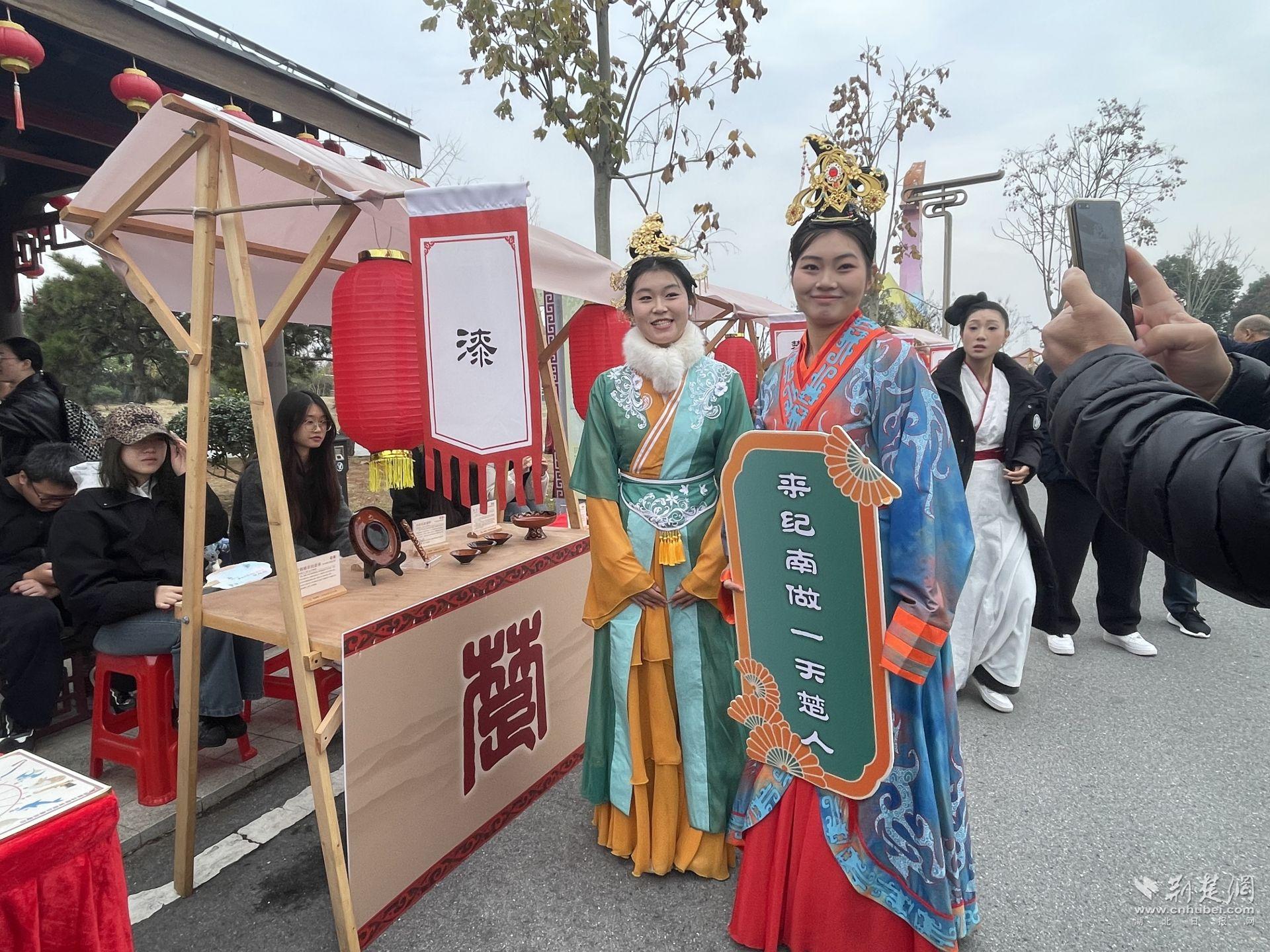 园区全天设有楚礼楚乐、社戏趣闻、国潮说唱等各类演出,现场开设楚绣、漆器、楚简书法、磨鹰风筝等亲手制作楚风小物的非遗体验区,楚式舞蹈、街头杂技等街头卖艺区,荆州鱼糕、温饮米酒等楚地风味美食小吃区。游客们在这片楚韵流转的天地,穿越回楚国,体验了做一天的“楚国人”。