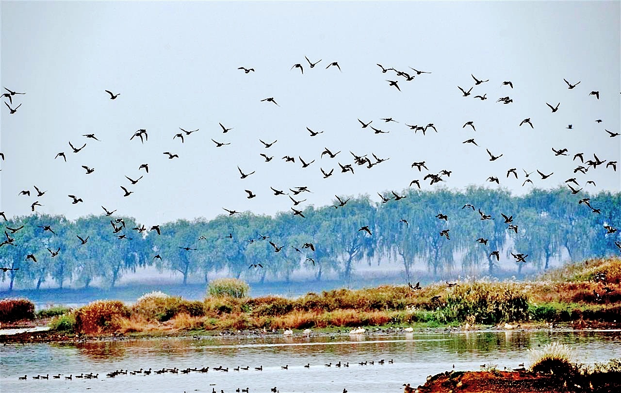 当天下午,天鹅湖湖面一派祥和灵动景象。大量豆雁、灰雁、罗纹鸭、绿头鸭等雁鸭类候鸟齐聚于此。它们或在湖中游弋觅食,或在岸边舒展翅膀晒太阳,时而有成群候鸟振翅起飞,在天空中形成壮观的飞鸟阵列。令人惊喜的是,其中还有数量不菲的国家二级保护动物,小天鹅姿态优雅,白琵鹭长喙轻啄,为这片生态秘境更增观赏价值。
