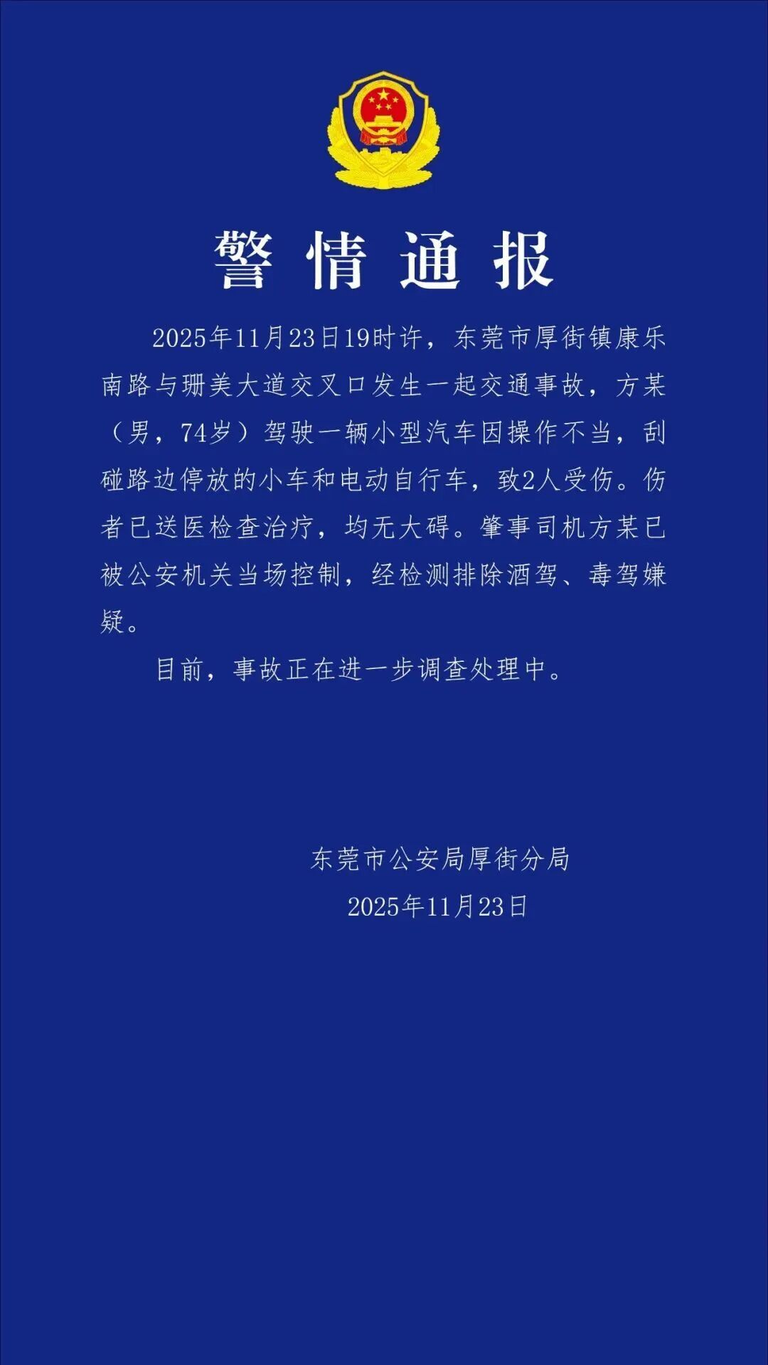 11月23日19时许,东莞市厚街镇康乐南路与珊美大道交叉口发生一起交通事故,方某(男,74岁)驾驶一辆小型汽车因操作不当,刮碰路边停放的小车和电动自行车,致2人受伤。伤者已送医检查治疗,均无大碍。肇事司机方某已被公安机关当场控制,经检测排除酒驾、毒驾嫌疑。目前,事故正在进一步调查处理中。