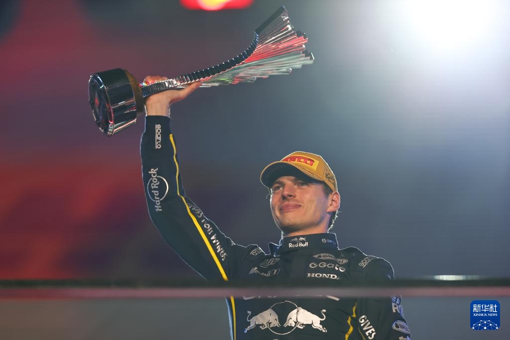 11月22日,冠军红牛车队荷兰车手维斯塔潘在颁奖仪式上举起奖杯。