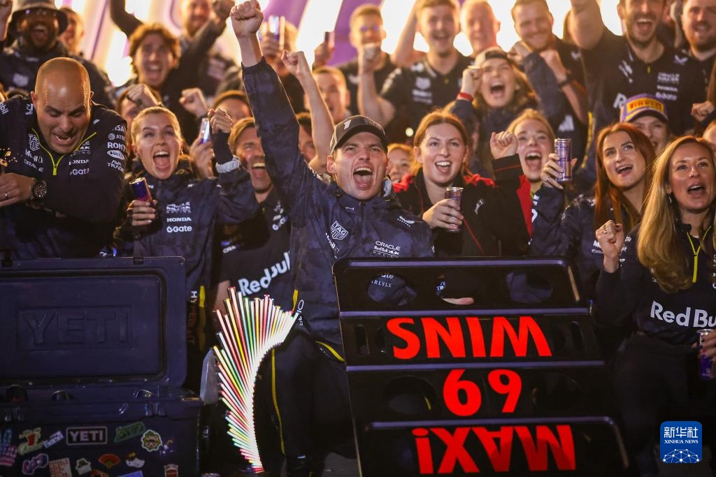 11月22日,冠军红牛车队荷兰车手维斯塔潘(中)赛后与车队一起庆祝夺冠。