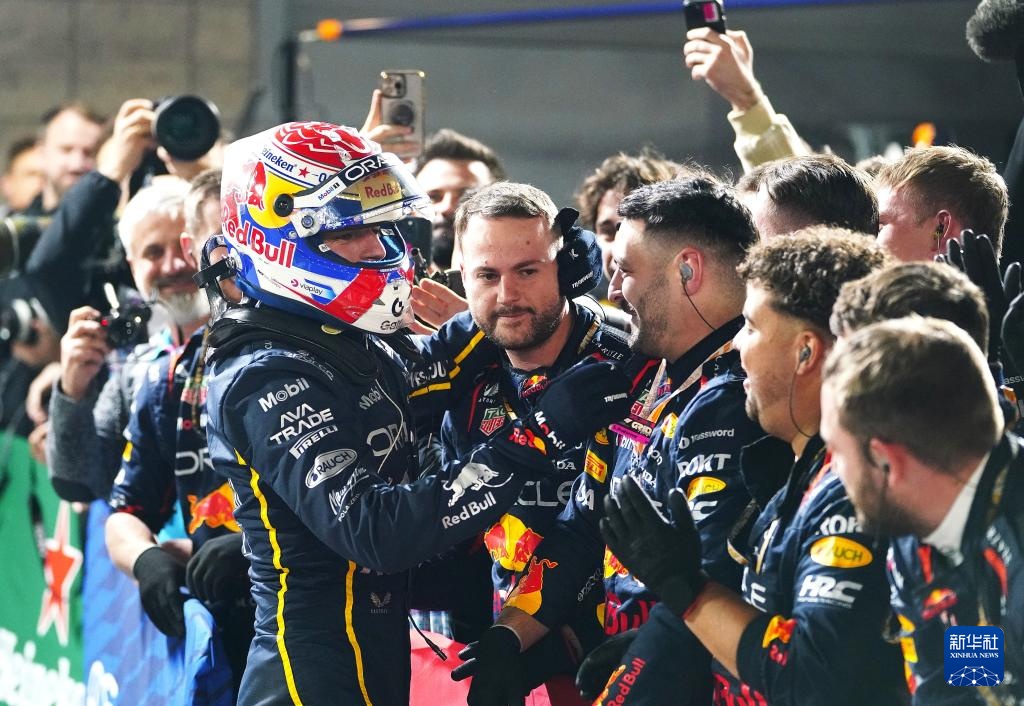 11月22日,红牛车队荷兰车手维斯塔潘(左)夺冠后接受祝贺。