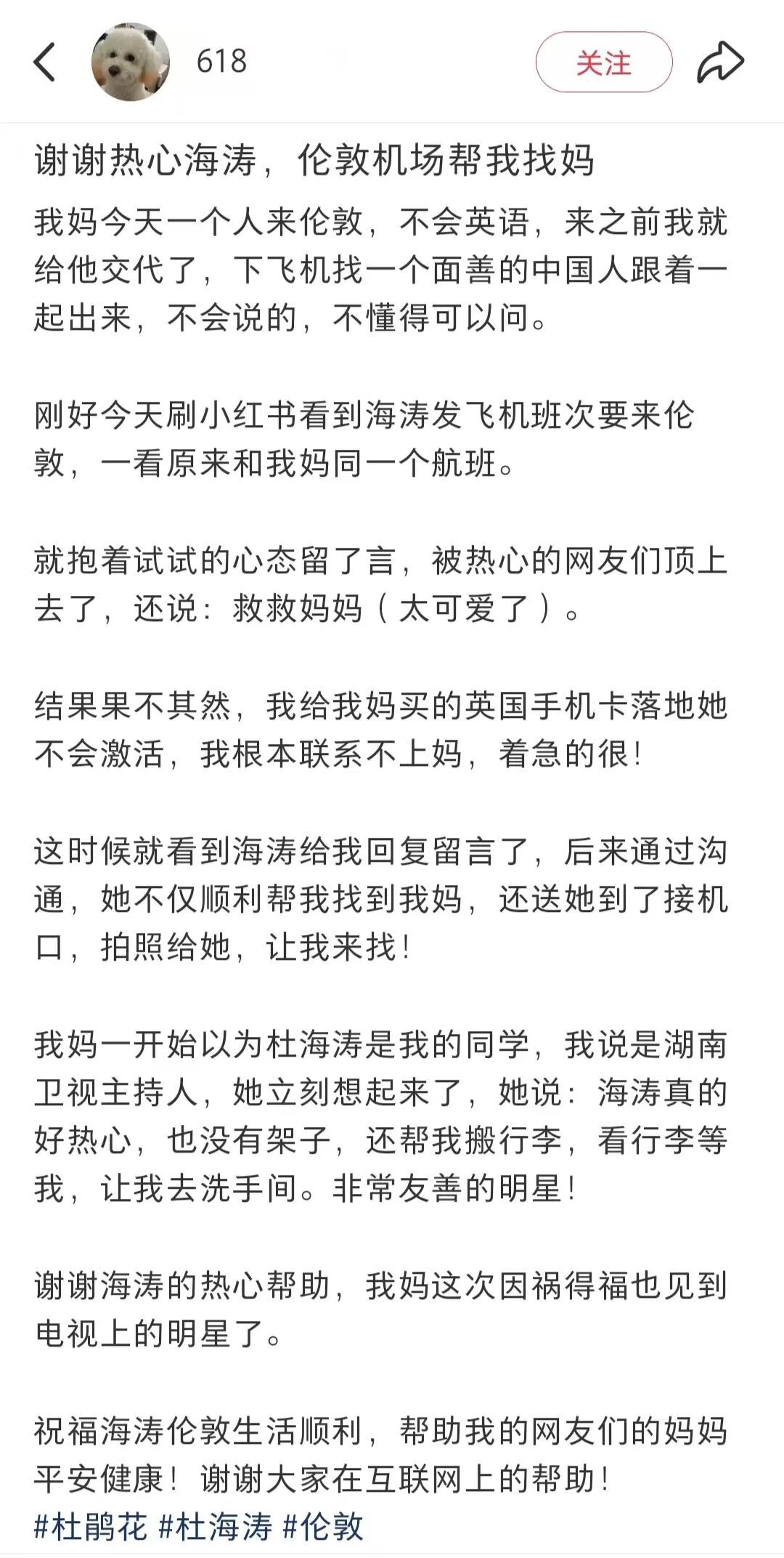 该网友透露,自己母亲首次来伦敦且不懂英语,其担心母亲下飞机后无法沟通联系,恰好得知母亲与杜海涛搭乘同一航班,便留言求助。