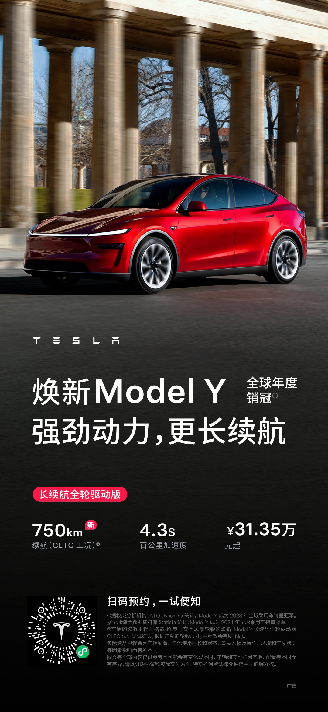 特斯拉介绍,焕新Model Y长续航全轮驱动版车型,750公里超长续航,售价31.35万起。