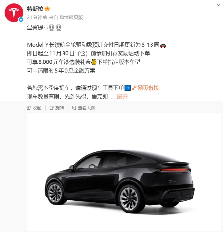 11 月 24 日消息,特斯拉中国官博今日宣布,Model Y 长续航全轮驱动版预计交付日期更新为8-13周。即日起至11月30日(含)前参加引荐奖励活动下单,可享8000元车漆选装礼金,下单指定版本车型,可申请限时5年0息金融方案。