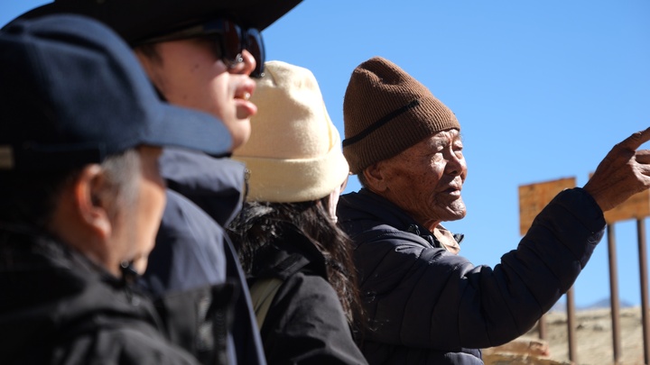 这是守窟人之一的仁增旺扎老人在向游客介绍遗址情况。(2025年11月14日摄)新华社记者 庄云凯 摄