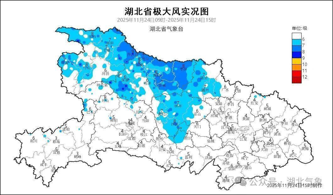 湖北日报讯(记者曾莉)11月24日早晨,湖北大部地区气温下降,北部地区7时气温较前一日降低1至6℃。省气象台5时发布大风蓝色省级预警,预计24日白天至前半夜,湖北自北向南将出现6到7级偏北阵风,局地阵风8级以上。