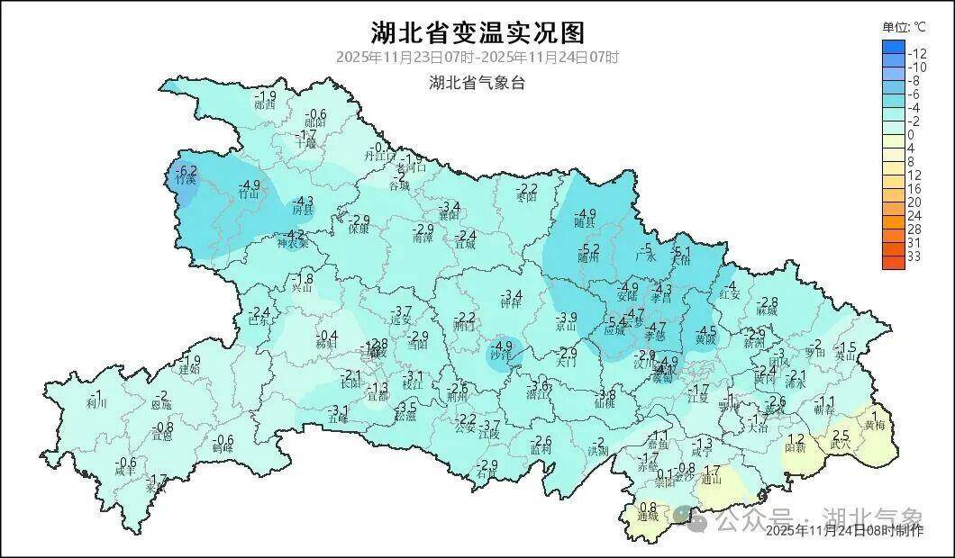 本周湖北依旧是晴到多云为主,但全省有大风降温天气。目前,冷空气率先影响鄂西北一带,24日鄂西北西部最高气温降至11至16℃,中东部地区最高气温仍在20℃上下。24日晚至26日,受干冷空气影响,全省的平均气温会下降4至6℃,最低气温降幅明显,北部地区最低气温降至冰点以下,南部地区最低气温降至0至4℃。27日至30日气温回升,最高气温16至22℃,最低气温逐步升至-1至5℃。
