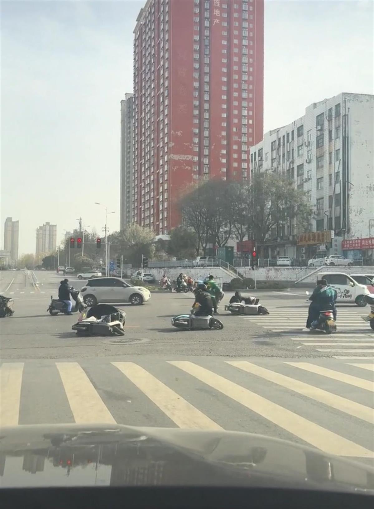 一网传视频中,在一交叉路口,多人骑电瓶车通过时摔倒在地,画面中树枝在大幅摇晃,有路人前去帮忙扶车。