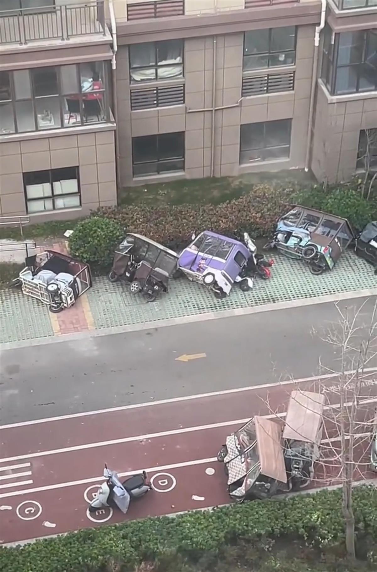 有周口网友在小区拍摄的视频显示,一排带有顶棚的三轮电瓶车全部被吹倒。还有小区晾晒的棉被被大风撕裂,所剩无几。