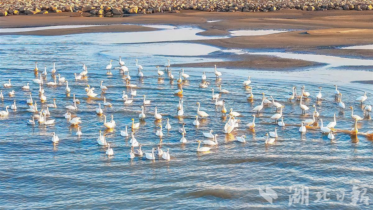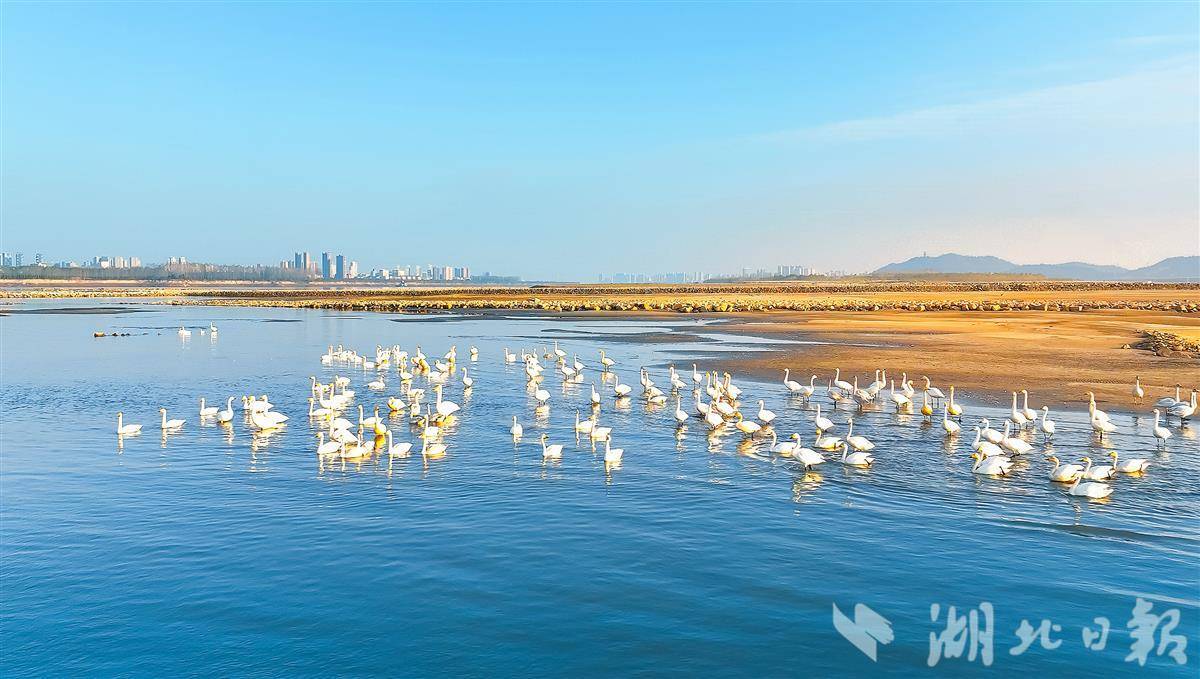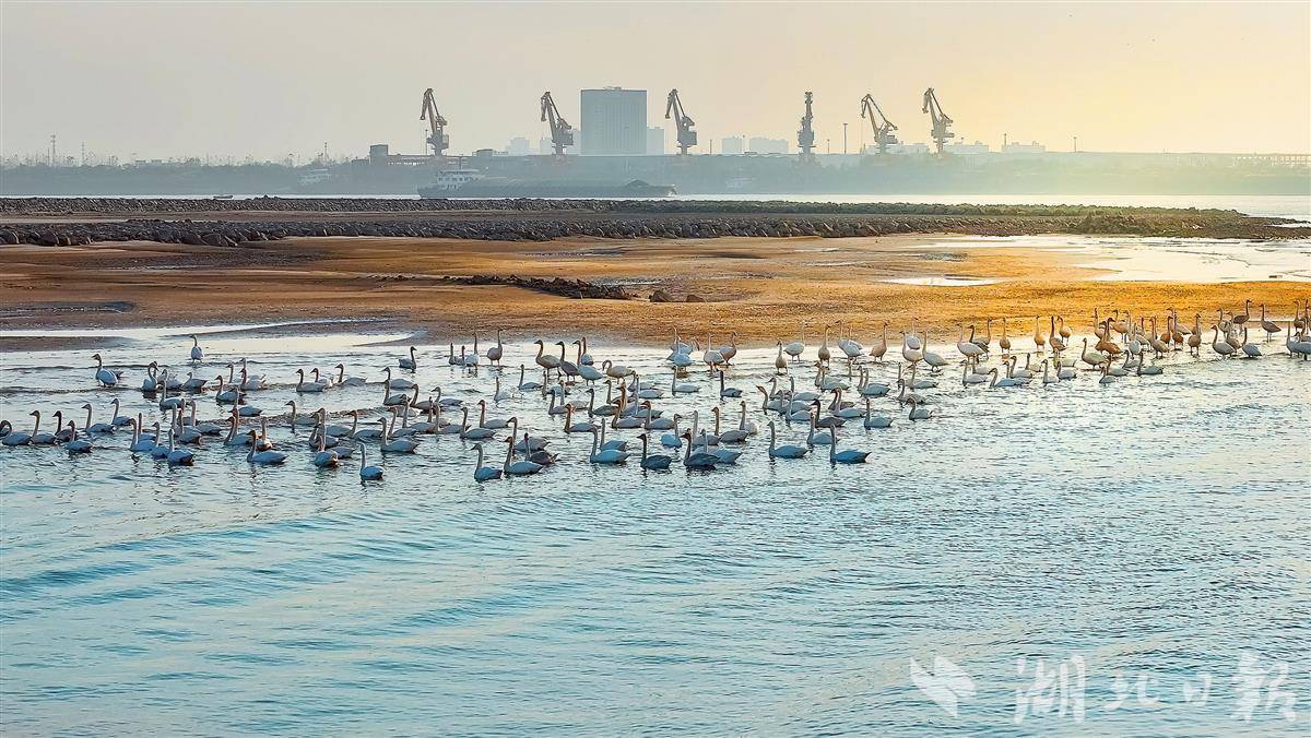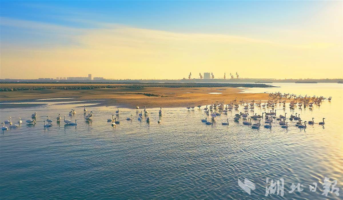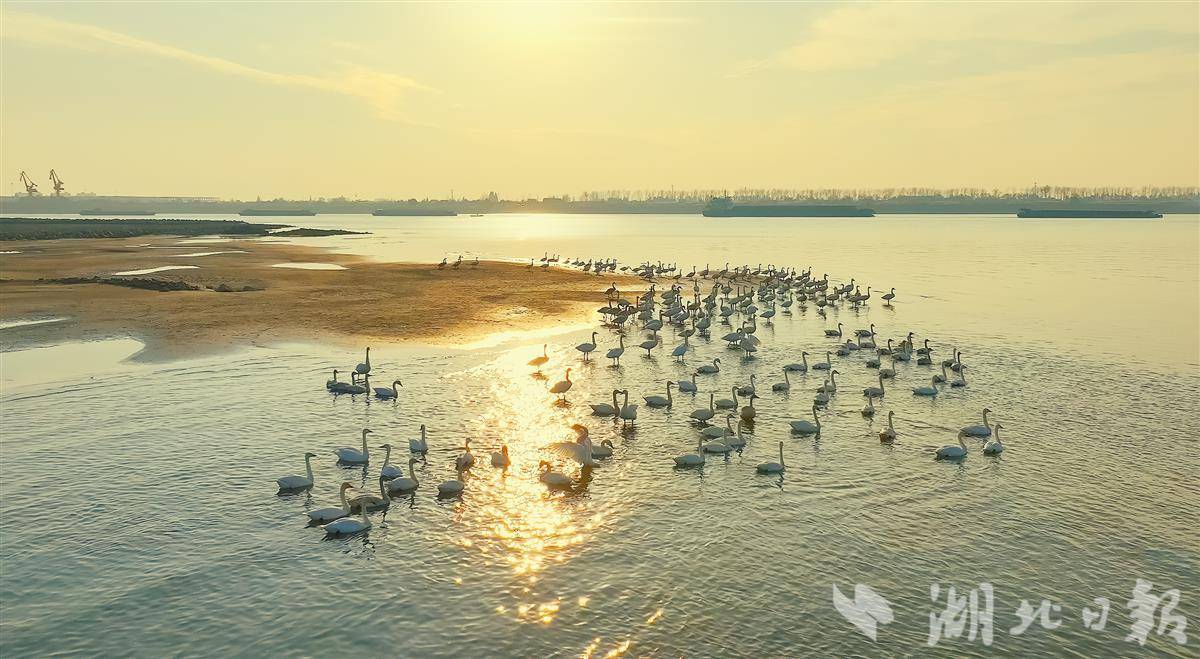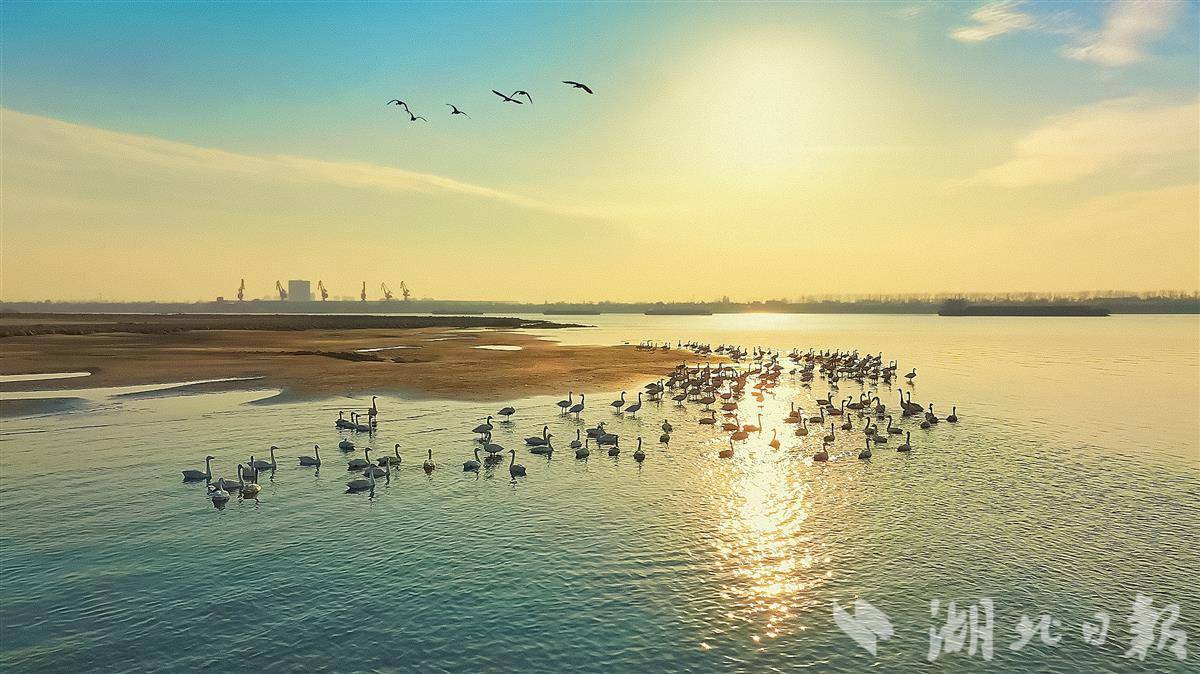 连日来,长江鄂州段得胜洲迎来了首批数百只迁徙越冬天鹅,它们在江面上悠闲地戏水觅食,构成一幅妙趣横生的冬日画卷。近年来,鄂州市通过生态修复、禁渔执法、排污整治等措施推进长江大保护,生态环境持续向好,每年来长江鄂州段沙洲越冬的野生鸟类品种和数量不断增加。(视界网 方仲华 肖开斌 摄)
