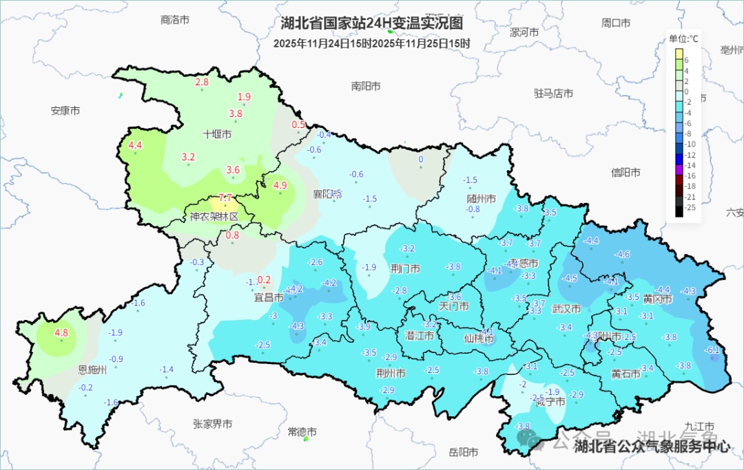 11月26日08时-27日08时,鄂西北多云到晴天,其中神农架高山区局地有雨夹雪;其他地区晴天到多云。最高气温16~20℃,最低气温北部-3~1℃、南部1~5℃,偏南风2到3级转偏北风3到4级、阵风5到7级,局地8级。