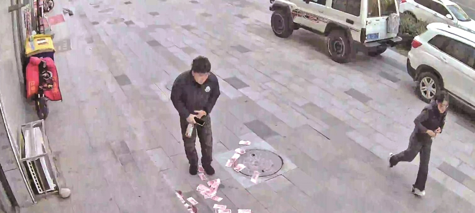 11月24日,鑫鑫和家人徐先生从银行取出5万元现金,开车前往位于河北省定兴县朝阳路的店铺。13时36分许,徐先生将现金揣进外套,和鑫鑫下车。在店铺门前,一阵大风刮来,徐先生怀中的现金不慎掉在地上,瞬间被风吹走大半,还有一些散落在地面上。徐先生一时愣在了原地,不知所措。鑫鑫向记者回忆,现金是成捆的,摔到地上后就散掉了,“他的外套内还剩了一些钱,就赶紧用手捂着怕剩下的钱掉出来。”