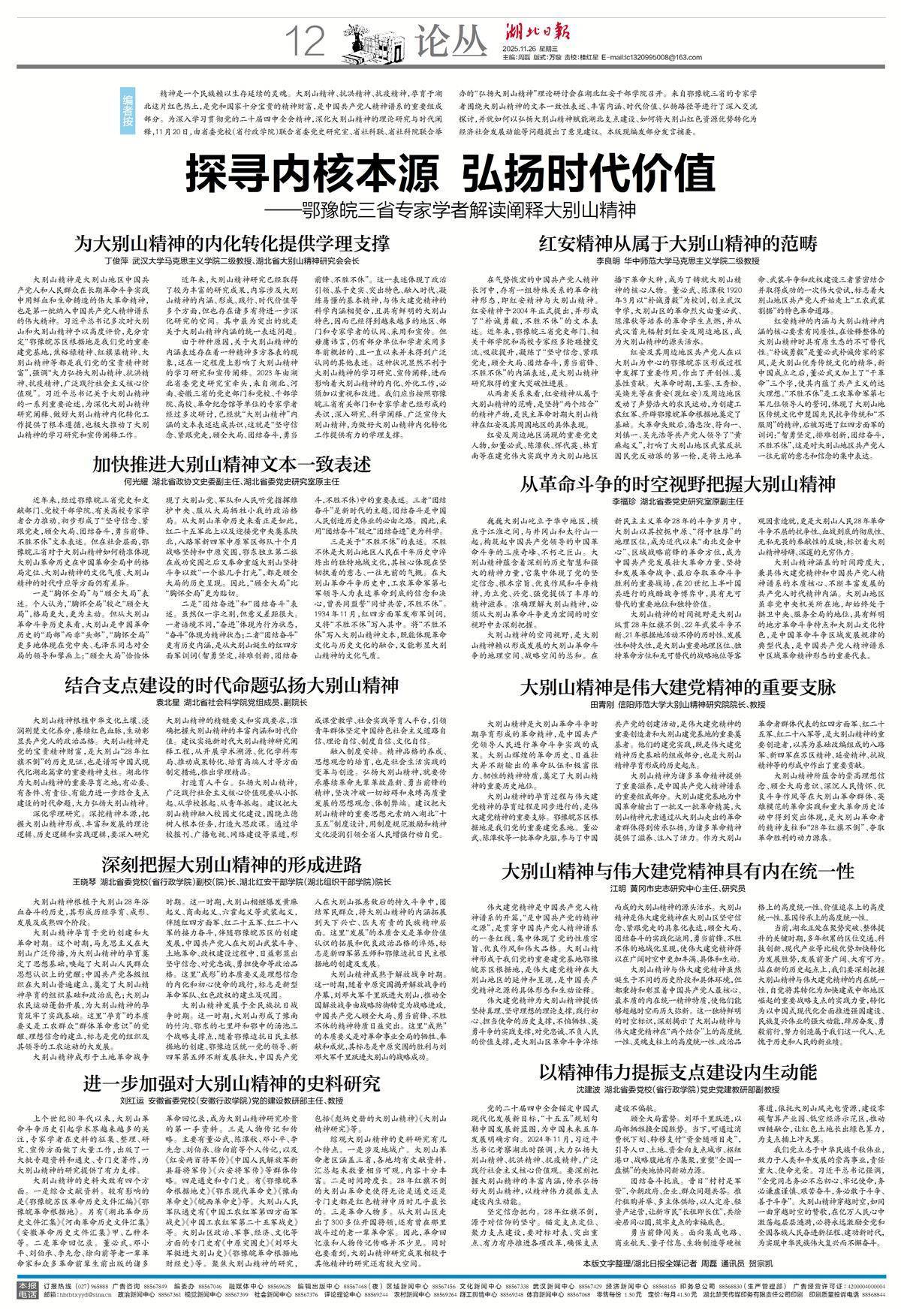 精神是一个民族赖以生存延续的灵魂。大别山精神、抗洪精神、抗疫精神,孕育于湖北这片红色热土,是党和国家十分宝贵的精神财富,是中国共产党人精神谱系的重要组成部分。为深入学习贯彻党的二十届四中全会精神,深化大别山精神的理论研究与时代阐释,11月20日,由省委党校(省行政学院)联合省委党史研究室、省社科联、省社科院联合举办的“弘扬大别山精神”理论研讨会在湖北红安干部学院召开。来自鄂豫皖三省的专家学者围绕大别山精神的文本一致性表述、丰富内涵、时代价值、弘扬路径等进行了深入交流探讨,并就如何以弘扬大别山精神赋能湖北支点建设、如何将大别山红色资源优势转化为经济社会发展动能等问题提出了意见建议。