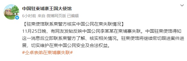 中国驻柬埔寨王国大使馆发文:11月25日晚,有网友发帖反映中国公民李某某在柬埔寨失联。中国驻柬使馆得知这一消息后立即联系柬警方了解、核实相关情况。驻柬使馆将继续密切跟进案件进展,切实维护在柬中国公民安全及合法权益。
