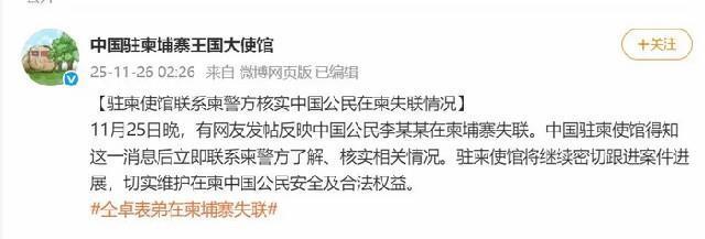 26日凌晨,中国驻柬使馆发文称,得知这一消息后立即联系柬警方了解、核实相关情况。并称将继续密切跟进案件进展,切实维护在柬中国公民安全及合法权益。11月26日,李怡亨的亲属李先生告诉极目新闻记者,中国驻柬使馆已与他们取得联系,让他们提供了李怡亨的照片和失联前最后位置信息。李先生称,李怡亨的母亲了解这一情况后感到非常欣慰,激动得热泪盈眶,此前紧张的内心稍微平复了一些。李先生也在山西临汾尧都区公安局报了警,警方给他们出具了立案告知书。