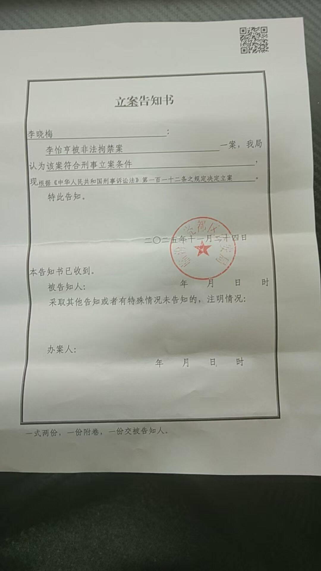 李怡亨的亲属在临汾市尧都区公安局报案,警方向其出具立案通知(受访者供图)